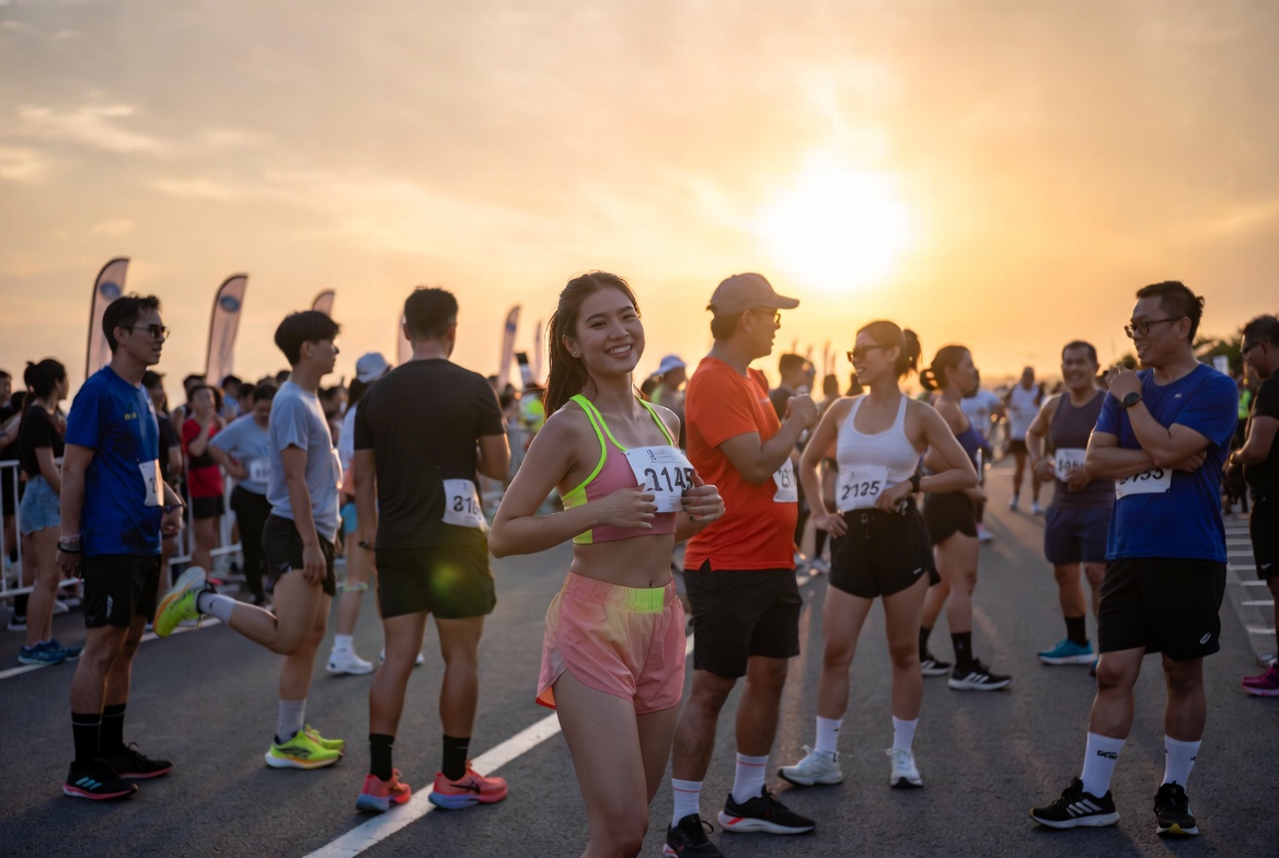 Race day is early. 5K and 10K races typically gun off at 5:00 or 5:30 AM, while 21K and 42K races often start as early as 4:00 AM to beat the heat. You'll pick up your race kit beforehand — usually a singlet, a bib, and sometimes a finisher shirt or medal at the end.