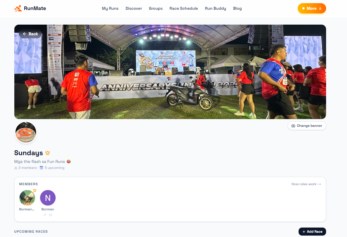 RunMate Groups exists because those crews deserve more than a thread in Messenger. A real space where your group's upcoming races, members, and history all live together.